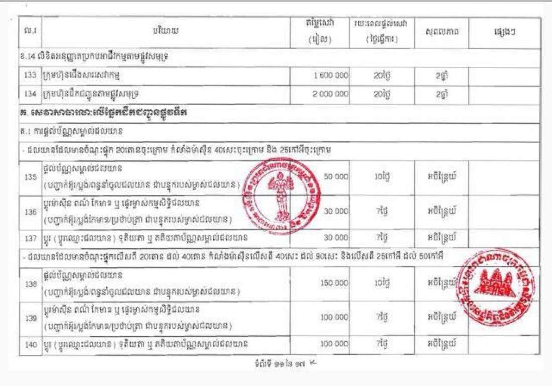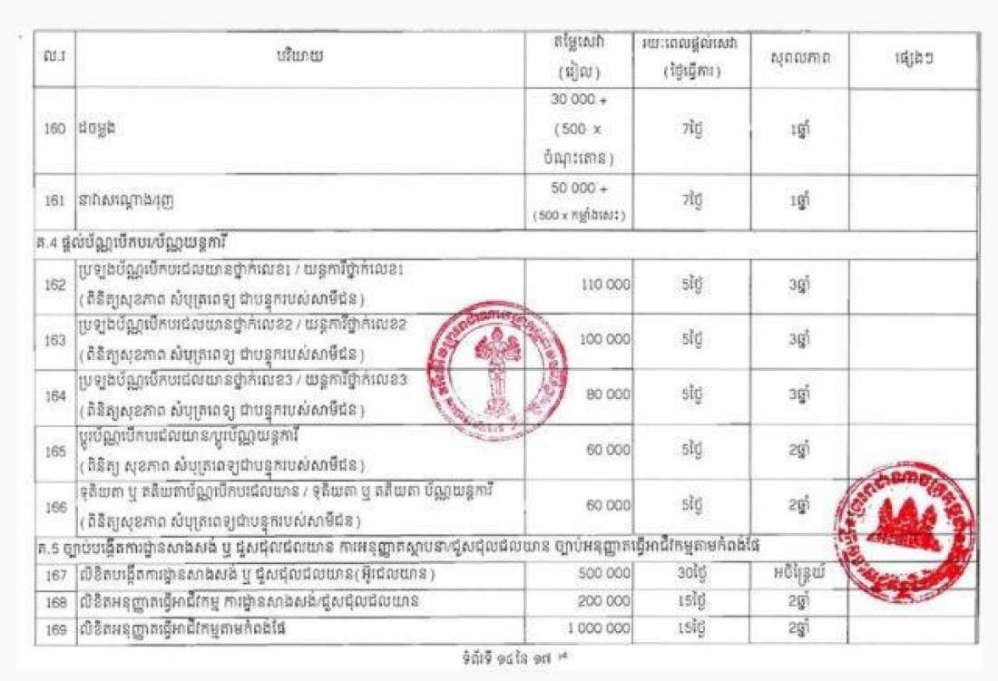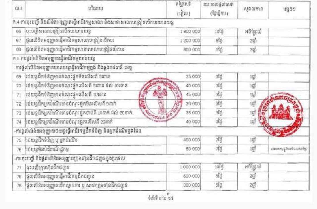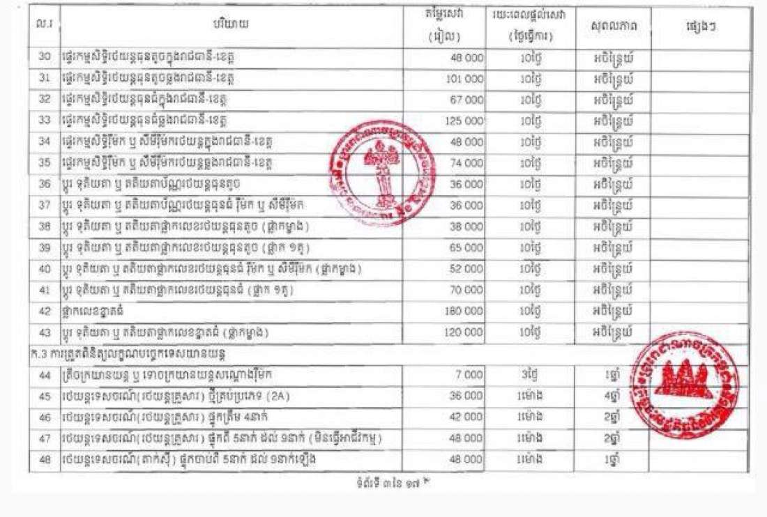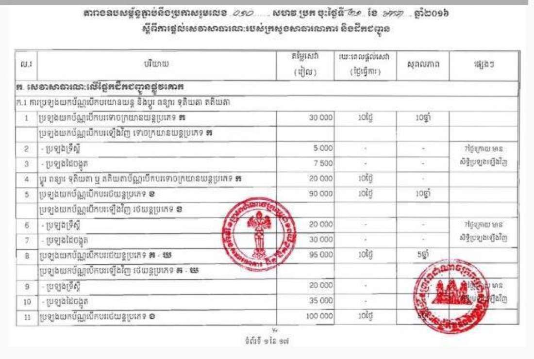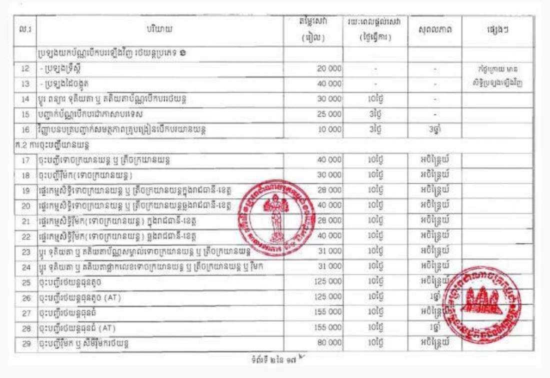 ក្នុងនោះ រាល់ការប្តូរ ពន្យារប័ណ្ណបើកបររថយន្តគ្រប់ប្រភេទ តម្លៃ ៣ ម៉ឺនរៀល រយៈ ពេលផ្តល់សេវា ១០ ថ្ងៃ ( ថ្ងៃធ្វើការ )។ រីឯការបញ្ជាក់ប័ណ្ណបើកបរ ជាភាសាបរទេស តម្លៃ ២៥.០០០ រៀល។ចំណែកការចុះបញ្ជីយានយន្ត ( ធ្វើស្លាកលេខថ្មី និងប័ណ្ណសម្គាល់យានយន្ត ) ក៏ត្រូវបានប្រកាសនោះ កំណត់ថា ការចុះបញ្ជីទោចក្រយានយន្ត ឬត្រីចក្រយានយន្ត ថ្លៃ ៤ ម៉ឺនរៀល រយៈពេល ១០ ថ្ងៃ ( ថ្ងៃធ្វើការ ) សុពលភាព អចិន្ត្រៃយ៍។ ការចុះបញ្ជីរ៉ឺម៉ក ( ទោចក្រយានយន្ត ) ថ្លៃ ៣ម៉ឺនរៀល។