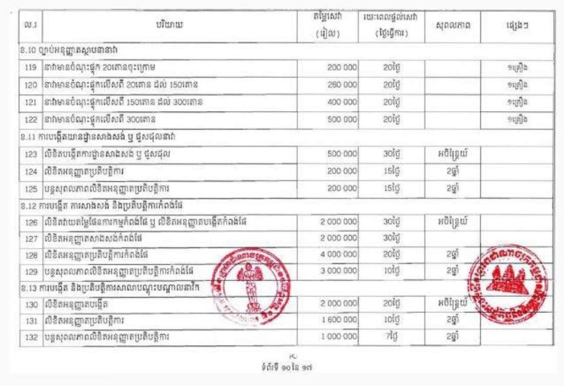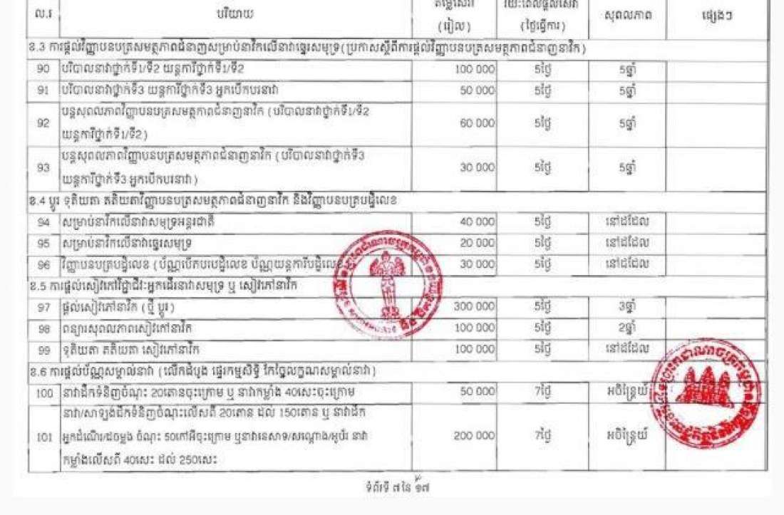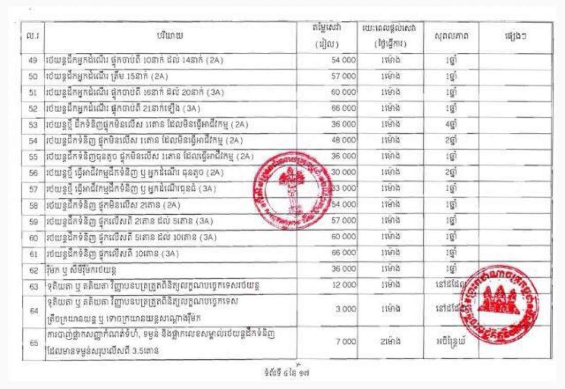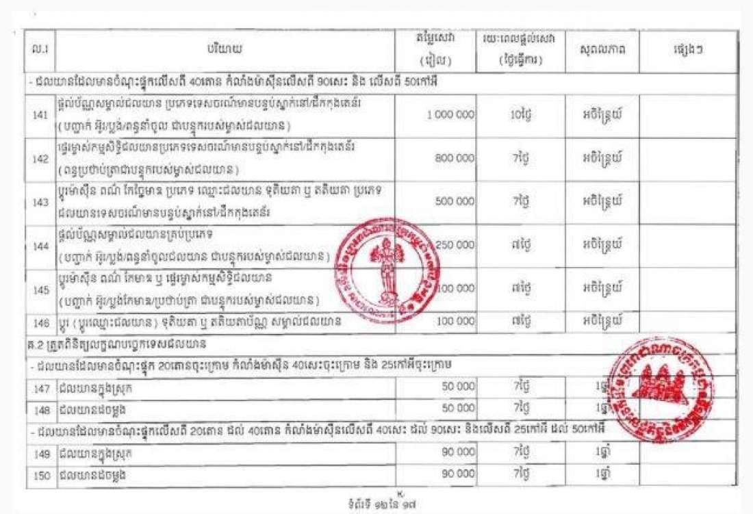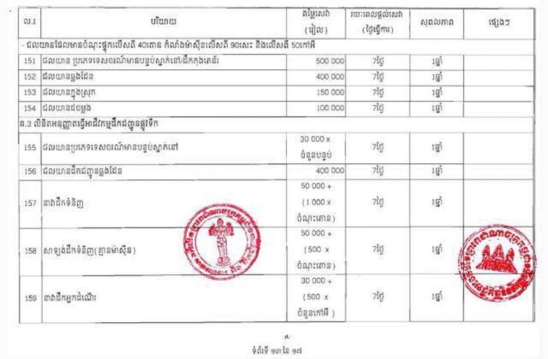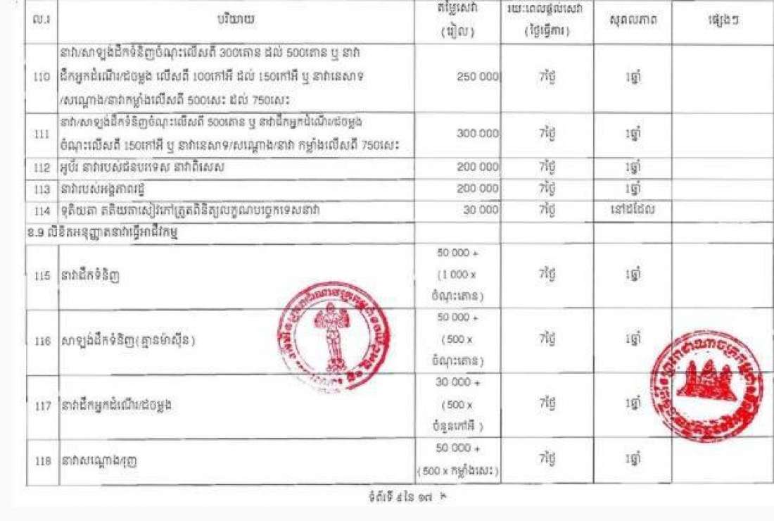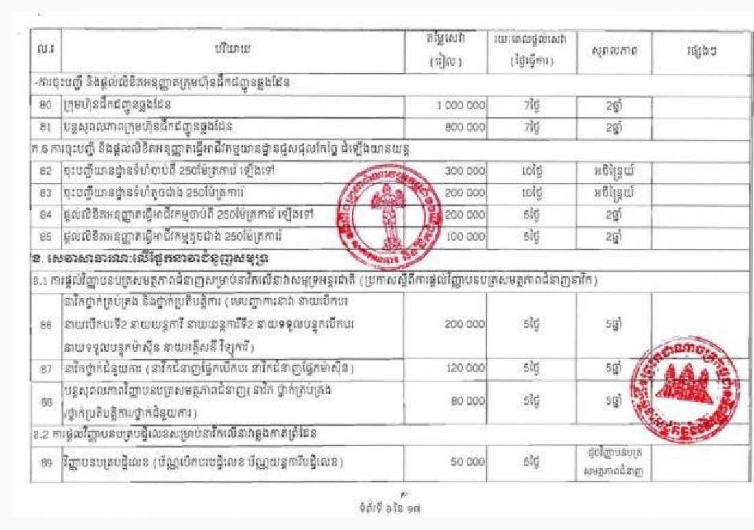 ក្នុងនោះ រាល់ការប្តូរ ពន្យារប័ណ្ណបើកបររថយន្តគ្រប់ប្រភេទ តម្លៃ ៣ ម៉ឺនរៀល រយៈ ពេលផ្តល់សេវា ១០ ថ្ងៃ ( ថ្ងៃធ្វើការ )។ រីឯការបញ្ជាក់ប័ណ្ណបើកបរ ជាភាសាបរទេស តម្លៃ ២៥.០០០ រៀល។ចំណែកការចុះបញ្ជីយានយន្ត ( ធ្វើស្លាកលេខថ្មី និងប័ណ្ណសម្គាល់យានយន្ត ) ក៏ត្រូវបានប្រកាសនោះ កំណត់ថា ការចុះបញ្ជីទោចក្រយានយន្ត ឬត្រីចក្រយានយន្ត ថ្លៃ ៤ ម៉ឺនរៀល រយៈពេល ១០ ថ្ងៃ ( ថ្ងៃធ្វើការ ) សុពលភាព អចិន្ត្រៃយ៍។ ការចុះបញ្ជីរ៉ឺម៉ក ( ទោចក្រយានយន្ត ) ថ្លៃ ៣ម៉ឺនរៀល។