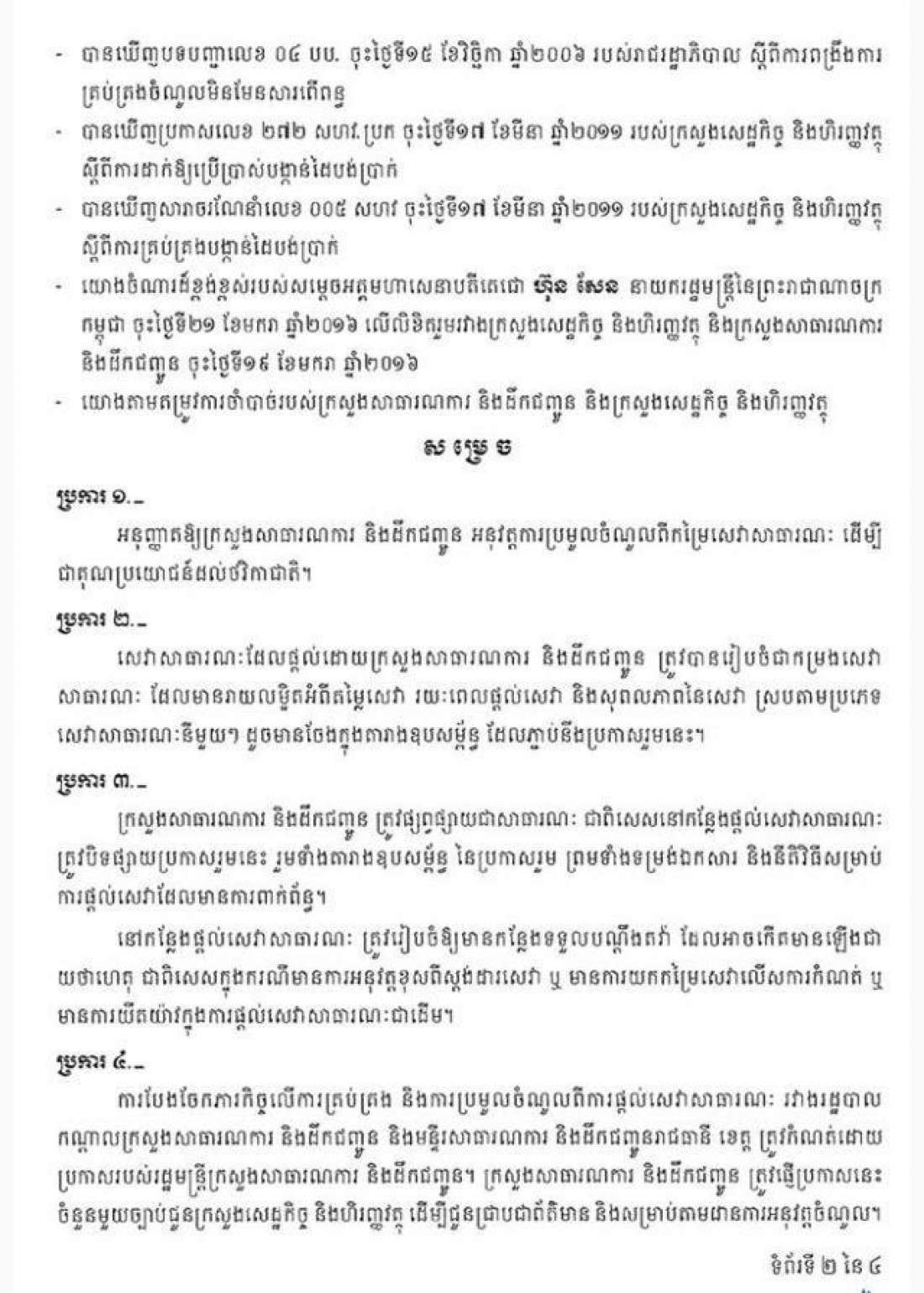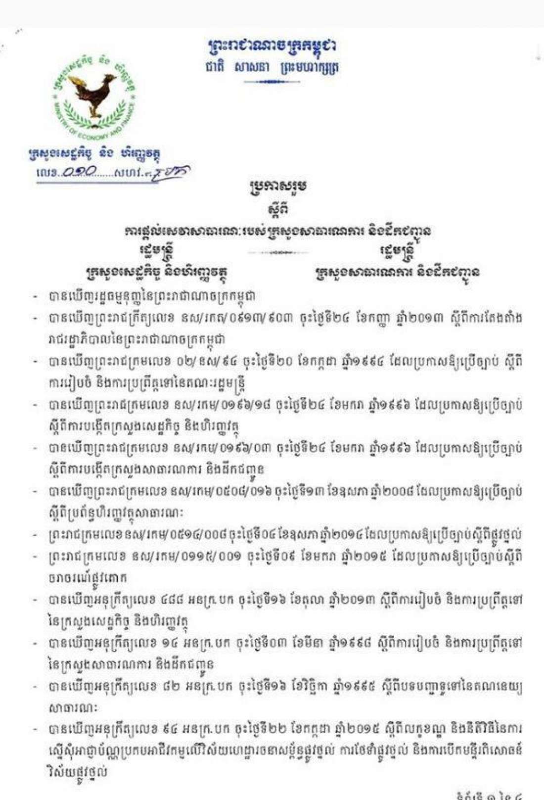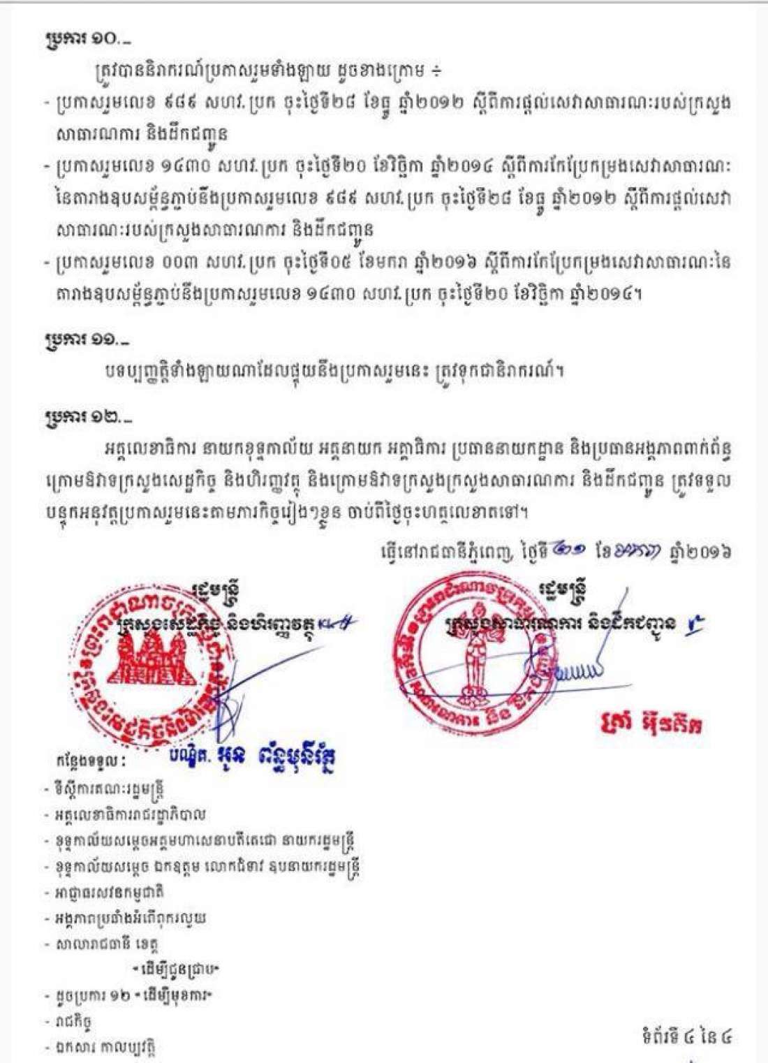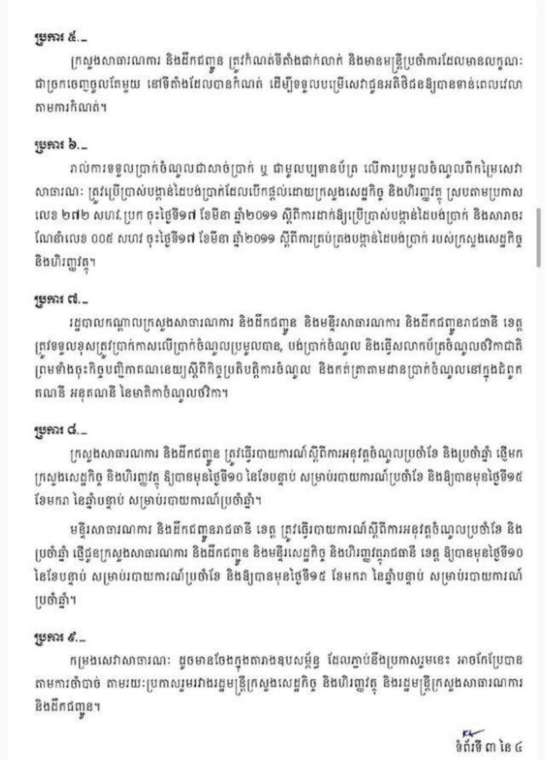 ក្នុងនោះ រាល់ការប្តូរ ពន្យារប័ណ្ណបើកបររថយន្តគ្រប់ប្រភេទ តម្លៃ ៣ ម៉ឺនរៀល រយៈ ពេលផ្តល់សេវា ១០ ថ្ងៃ ( ថ្ងៃធ្វើការ )។ រីឯការបញ្ជាក់ប័ណ្ណបើកបរ ជាភាសាបរទេស តម្លៃ ២៥.០០០ រៀល។ចំណែកការចុះបញ្ជីយានយន្ត ( ធ្វើស្លាកលេខថ្មី និងប័ណ្ណសម្គាល់យានយន្ត ) ក៏ត្រូវបានប្រកាសនោះ កំណត់ថា ការចុះបញ្ជីទោចក្រយានយន្ត ឬត្រីចក្រយានយន្ត ថ្លៃ ៤ ម៉ឺនរៀល រយៈពេល ១០ ថ្ងៃ ( ថ្ងៃធ្វើការ ) សុពលភាព អចិន្ត្រៃយ៍។ ការចុះបញ្ជីរ៉ឺម៉ក ( ទោចក្រយានយន្ត ) ថ្លៃ ៣ម៉ឺនរៀល។