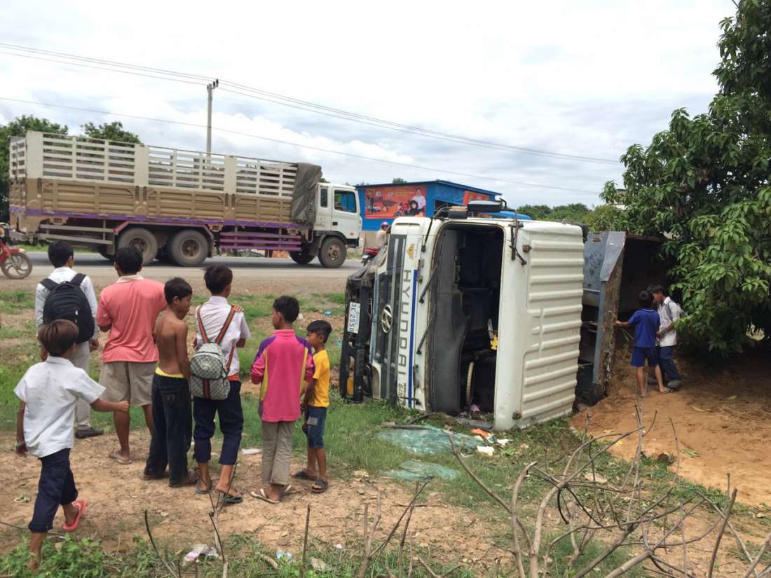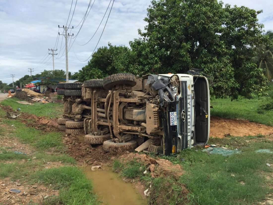 រាជធានីភ្នំពេញ ៖ ហេតុការណ៍គ្រោះថ្នាក់ចរាចរណ៍ដ៏គួរអោយភ្ញាក់ផ្អើលមួយ ដែលនឹកស្មានមិនដល់ថា គ្មានអ្នករងរបួសសោះ បន្ទាប់ពី បុរសម្នាក់បើករថយន្តហ៊ីយ៉ាន់ដាយដឹកដីធុនធំមួយគ្រឿងក្នុងល្បឿនលឿន វ៉ានឹងរថយន្តមួយគ្រឿងនៅពីមុខខ្លួនជ្រុលឡយចូលទៅចំណីផ្លូវម្ខាងទៀត បុកផ្ទប់រថយន្តឡិចស៊ិស RX330 ដែលជិះស្របត្រូវផ្លូវ ពីមុខពេញទំហឹងបណ្តាលអោយរថយន្តឡិចស៊ិស ផ្លោងខ្ទាតជាង ៥០ម៉ែត្រ រងការខូចខាត ចំណែករថយន្តបង្កជ្រុលចង្កូតធ្លាក់ផ្លូវក្រឡាប់ផ្ញារជើងច្រងាងតែម្តង ។
