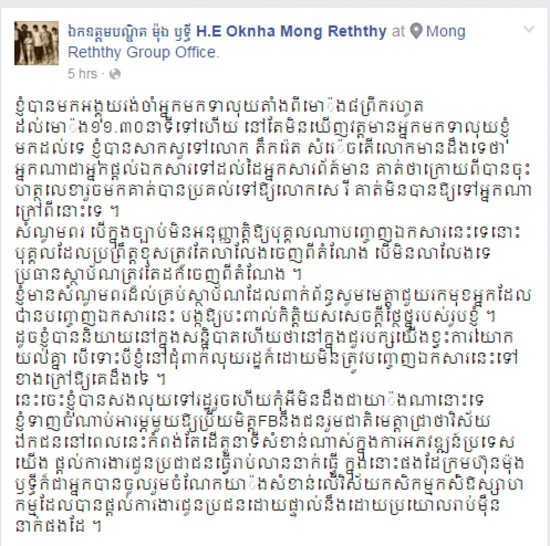 ខាងក្រោមនេះគឺជា អត្ថបទទាំងស្រុងដែលបានដកស្រង់ចេញពី ទំព័រហ្វេសបុកផ្ទាល់ខ្លួនរបស់ឯកឧត្តម៖