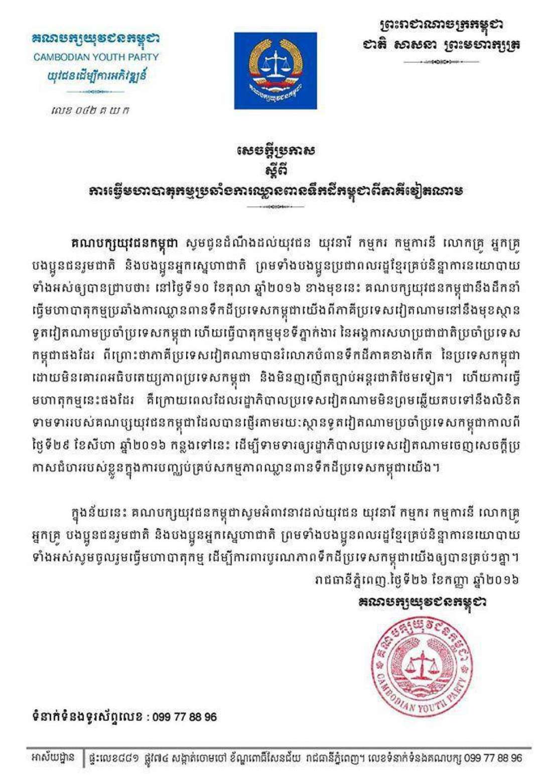រាជធានីភ្នំពេញ៖ គណបក្សយុវជនកម្ពុជានៅថ្ងៃទី២៦ខែកញ្ញាឆ្នាំ២០១៦បានចេញសេចក្តីប្រកាសព័ត៌មានបញ្ជាក់ថាគណបក្សនេះនឹងដឹកនាំមហាបាតុកម្មប្រឆាំងការឈ្លានពានទឹកដីពីភាគីវៀតណាម។គណបក្សបានអំពាវនាវដល់កម្មករ.គ្រូបង្រៀន យុវជននិងសាធារណជនចូលរួមបាតុកម្មដែលគ្រោងរៀបចំឡើងនៅថ្ងៃទី១០តុលាខាងមុខនេះ។