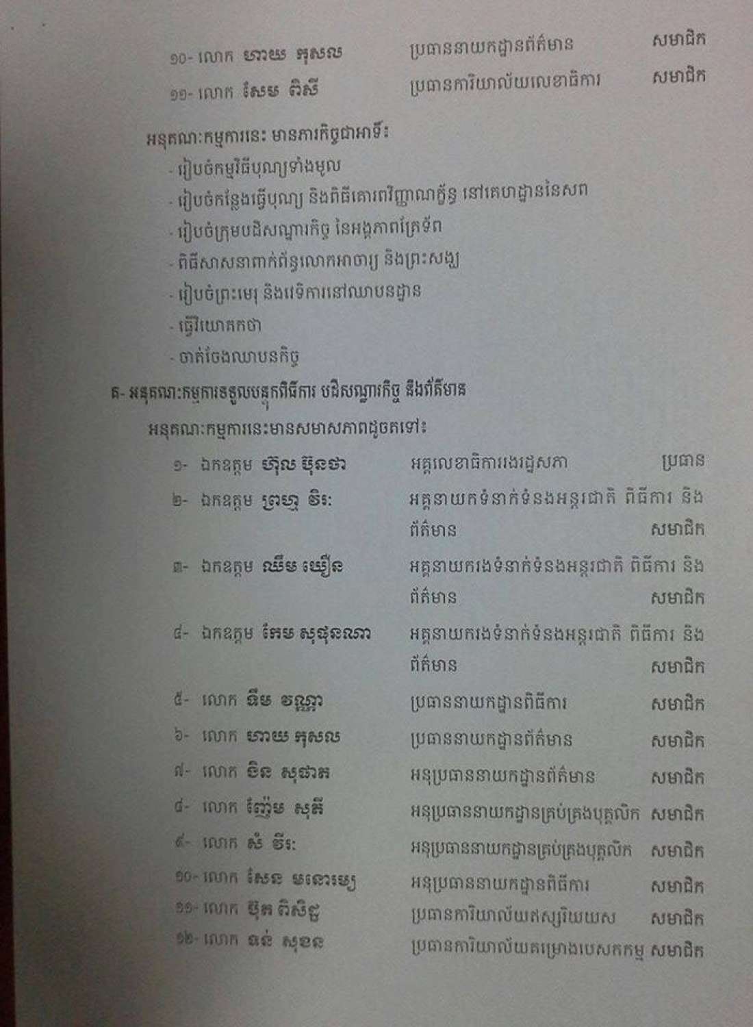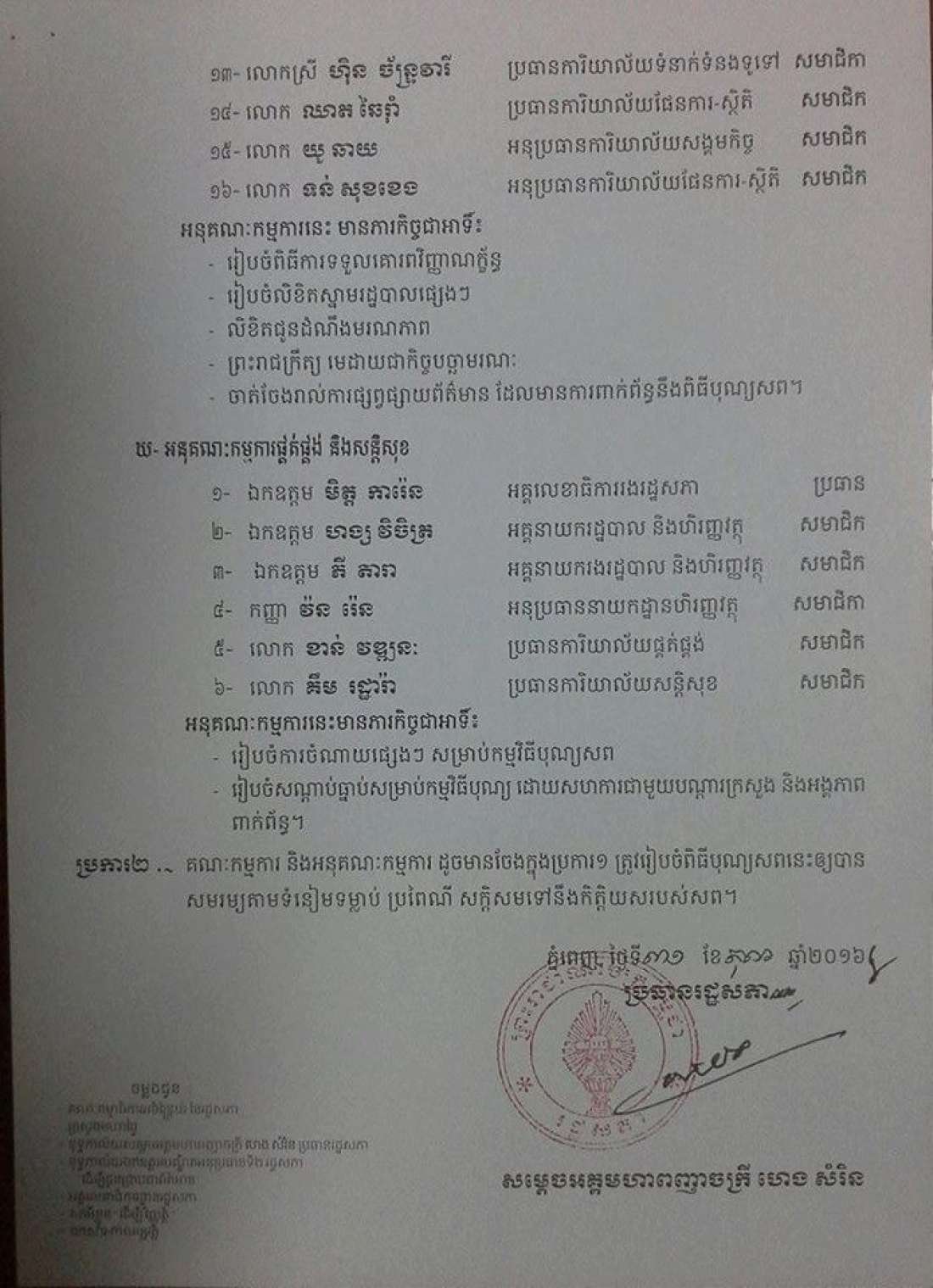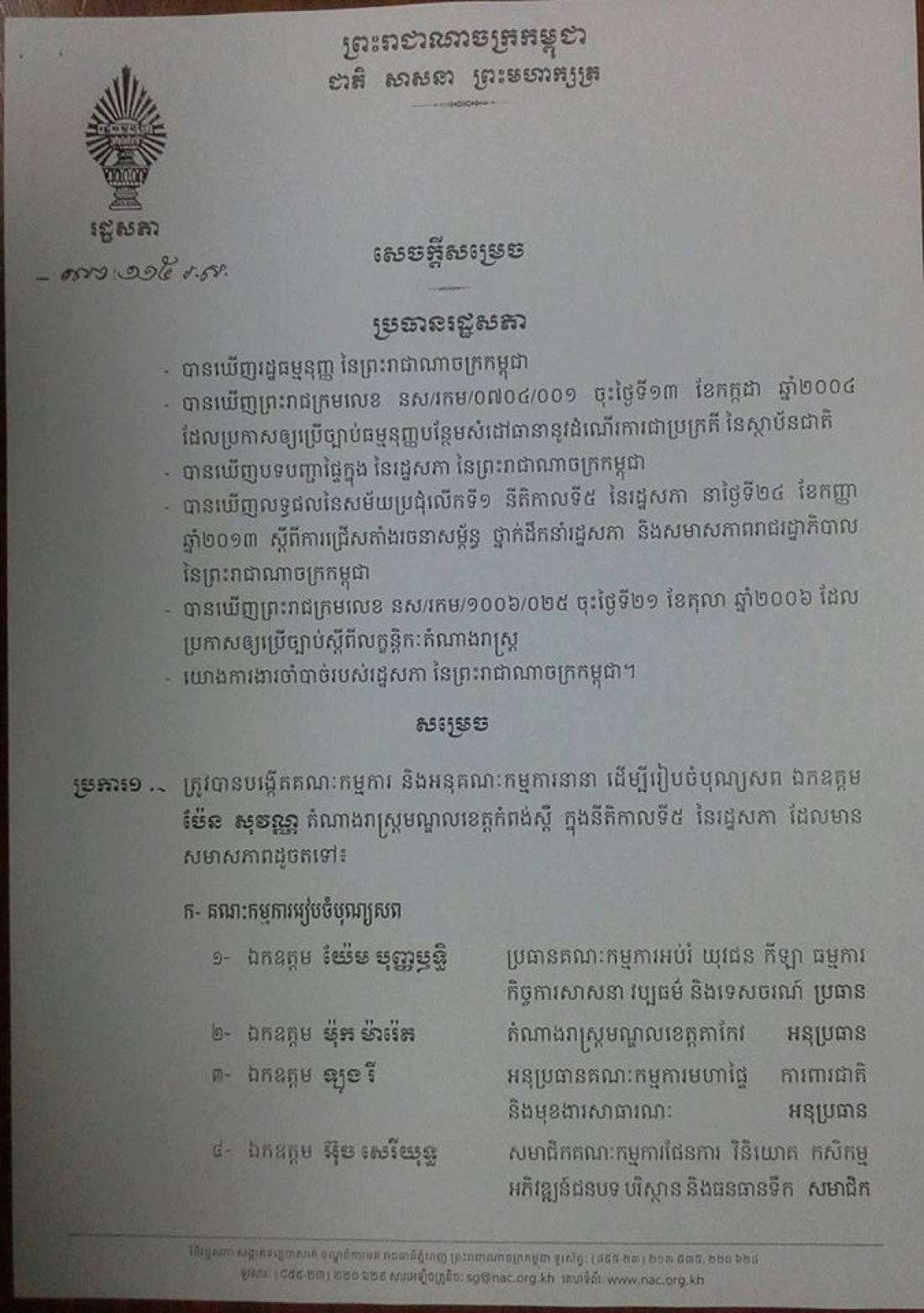 យោងតាមលិខិតចុះហត្ថលេខាដោយសម្ដេចហេងសំរិនប្រធានរដ្ឋសភាបានណែនាំបង្កើតគណៈកម្មការរៀបចំបុណ្យសព ឯកឧត្តម ប៉ែន សុវណ្ណ តំណាងរាស្ដ្រគណបក្សសង្គ្រោះជាតិមកពីខេត្តកំពង់ស្ពឺ។យោងលិខិតរបស់រដ្ឋសភាស្ដីពីការរៀបចំបុណ្យសពអ្នកតំណាងរាស្ដ្រប៉ែនសុវណ្ណលោកយ៉ែមបុញ្ញឬទ្ឋិនឹងត្រូវដឹកនាំប្រធានគណកម្មការរៀបចំបុណ្យនិងលោកម៉ុកម៉ារ៉េតជាអនុប្រធានគណៈកម្មការនិងមានមន្ដ្រីជិត៥០ជាជំនួយការរៀបចំបុណ្យសព។