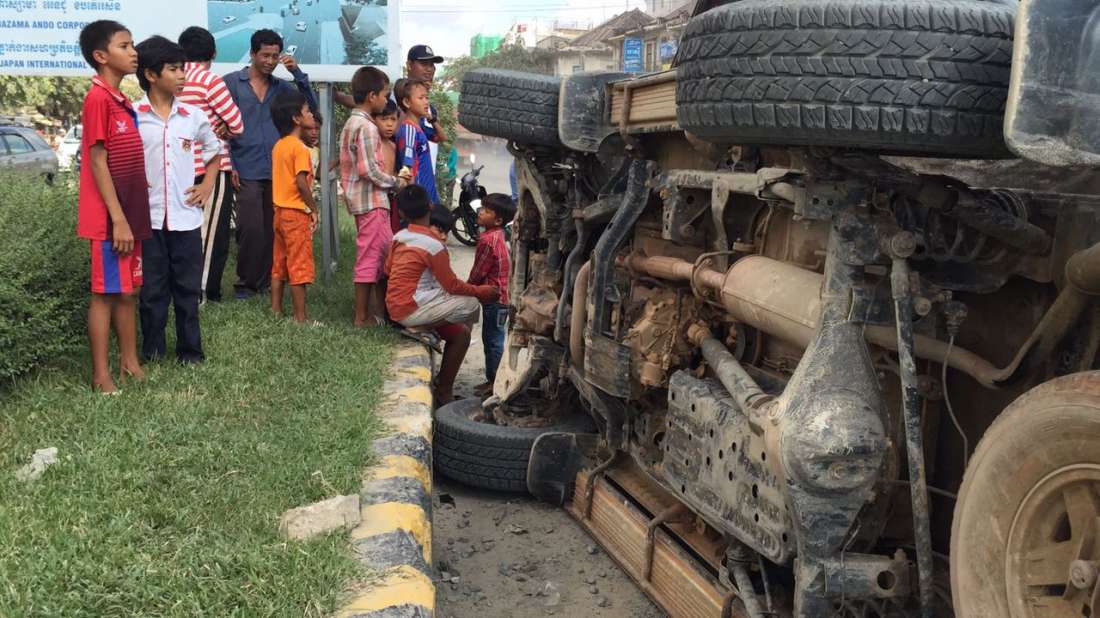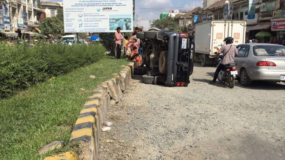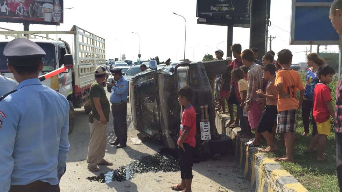 រាជធានីភ្នំពេញ៖ រថយន្តតូយូតា ១បាំងកន្លះ មួយគ្រេឿងបានក្រឡាប់ផ្ញារជើងច្រងាង នៅចំណុចគល់ស្ពានព្រះមុន្នីវង្សថ្មី បងនកការកកស្ទះជិត១ម៉ោង បន្ទាប់ពីម្ចាស់រថយន្តបើករថយន្តចុះពីស្ពានលេឿន ដាច់ហ្វ្រាំងរេចង្កូតទៅបុកផ្ទប់នឹងរបាំងថ្មសួនច្បារពេញទំហឹងបណ្តាលអោយក្រឡាប់តែម្តង តែសំណាងល្អ មិនមានបង្កគ្រោះថ្នាក់ដល់អ្នកដទៃ ។ ហេតុគ្រោះថ្នាក់នេះកើតឡើងកាលពីវេលាម៉ោង ១៣ និង ៣០នាទីរសៀលថ្ងៃទី ៩ ខែវិច្ឆិកា ឆ្នាំ២០១៦ នៅចំណុចគល់ស្ពានព្រះមុន្នីវង្សថ្មី ស្ថិតក្នុងសង្កាត់ច្បារអំពៅទី១ ខណ្ឌច្បារអំពៅ ។