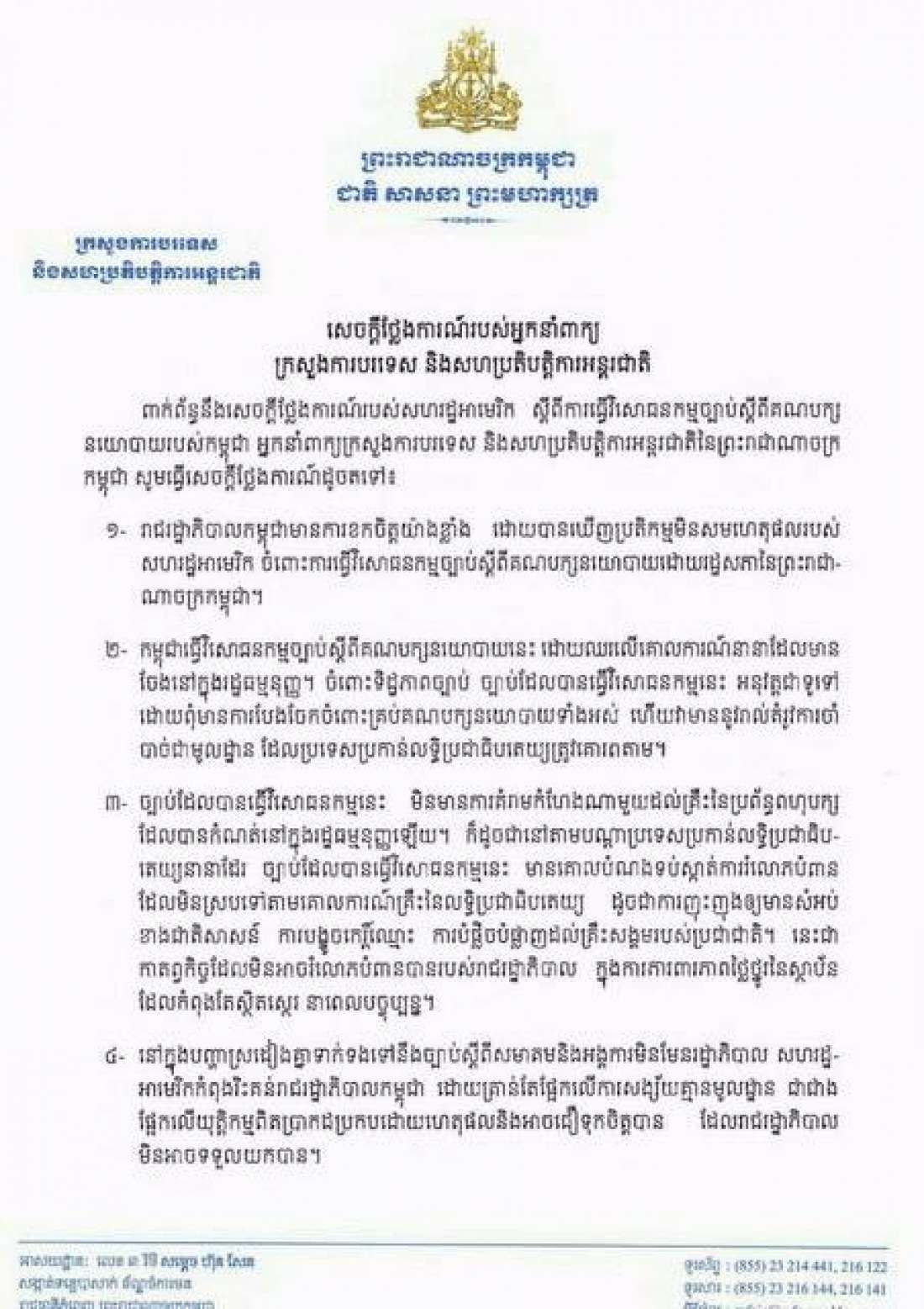 ១- រាជរដ្ឋាភិបាលកម្ពុជាមានការខកចិត្តយ៉ាងខ្លាំង ដោយបានឃើញប្រតិកម្មមិនសមហេតុផលរបស់សហរដ្ឋអាមេរិក ចំពោះការធ្វើវិសោធនកម្មច្បាប់ស្តីពីគណបក្សនយោបាយដោយរដ្ឋសភានៃព្រះរាជា-ណាចក្រកម្ពុជា។