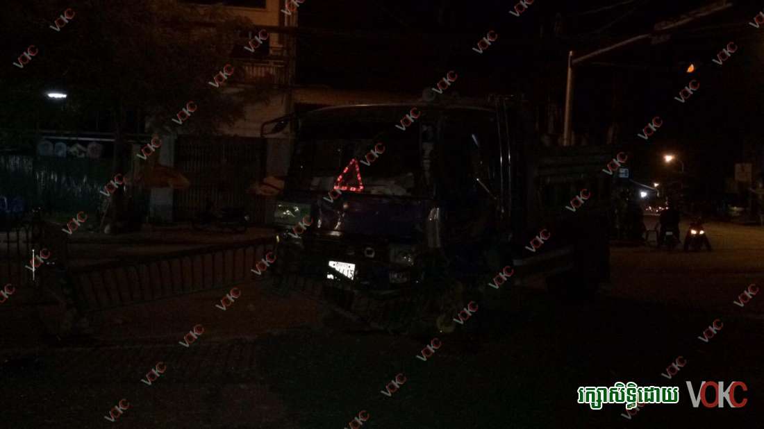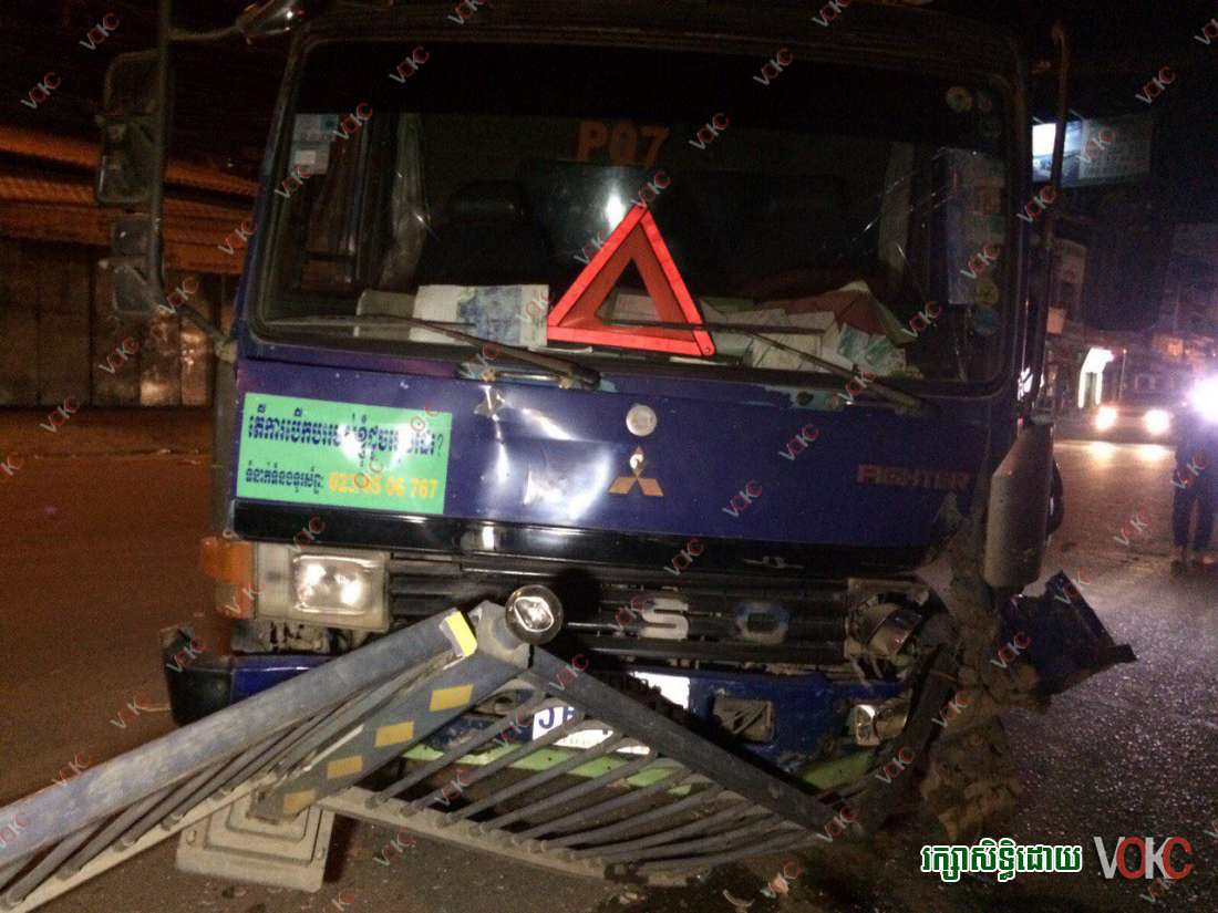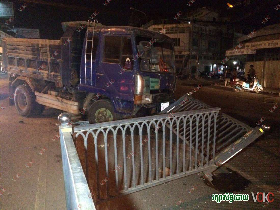 រាជធានីភ្នំពេញ ៖ រនាំងដែកពុះចែកទ្រូវផ្លូវចំនួន៣ផ្ទាំង ត្រូវរងការខូចខាត បន្ទាប់ពីមានរថយន្ត មីស៊ុយប៊ីស៊ី ដឹកដីធុនធំមួយគ្រឿង បើកបរដោយបុសម្នាក់ក្នុងល្បឿនលឿន មិនប្រយ័ត្នរេចង្កូត ជ្រុលបុករះពេញទំហឹង កាលពីវេលាម៉ោង ១១ និង ៣០នាទីយប់ថ្ងៃទី ១១ ខែមករា ឆ្នាំ២០១៥ នៅតាមបណ្តោយផ្លូវសហ័ពន្ធរុស្ស៊ី ក្បែរព្រលានយន្តហោះអន្តរជាតិភ្នំពេញ ក្នុងសង្កាត់កាកាប ខណ្ឌពោធិ៍សែនជ័យ ។
