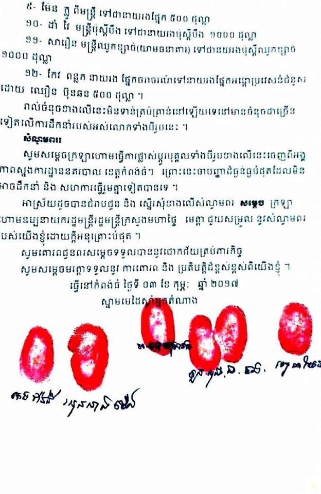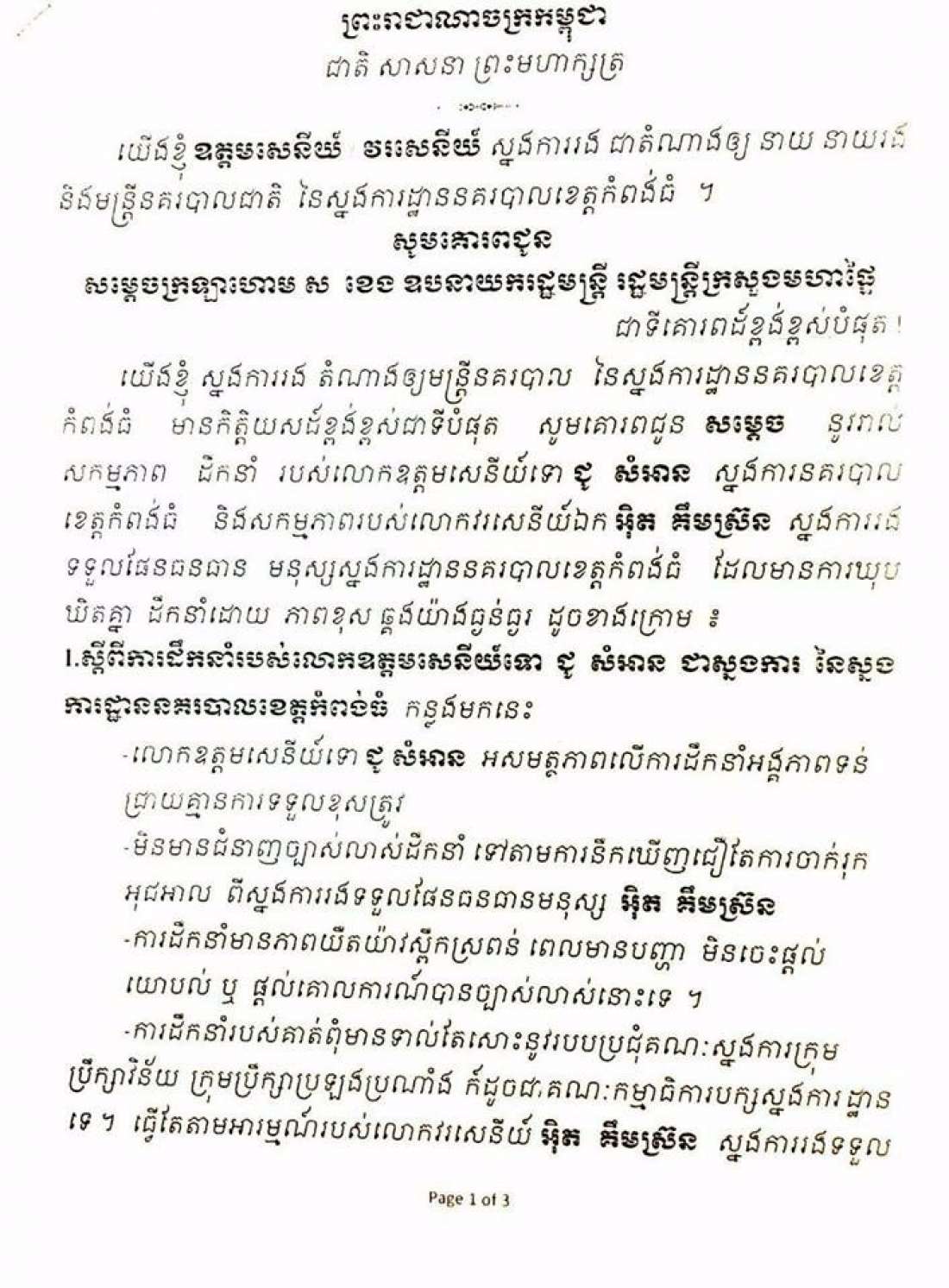 ពាក្យបណ្ដឹងនេះបានលើកឡើងដោយចោទថា លោកស្នងការបានឃុបឃិតជាមួយស្នងការរង អ៊ិត គឺមស្រ៊ន តែងតាំងមន្រ្តីថ្នាក់នាយរងប៉ុស្តិ៍ និងនាយការិយាល័យ