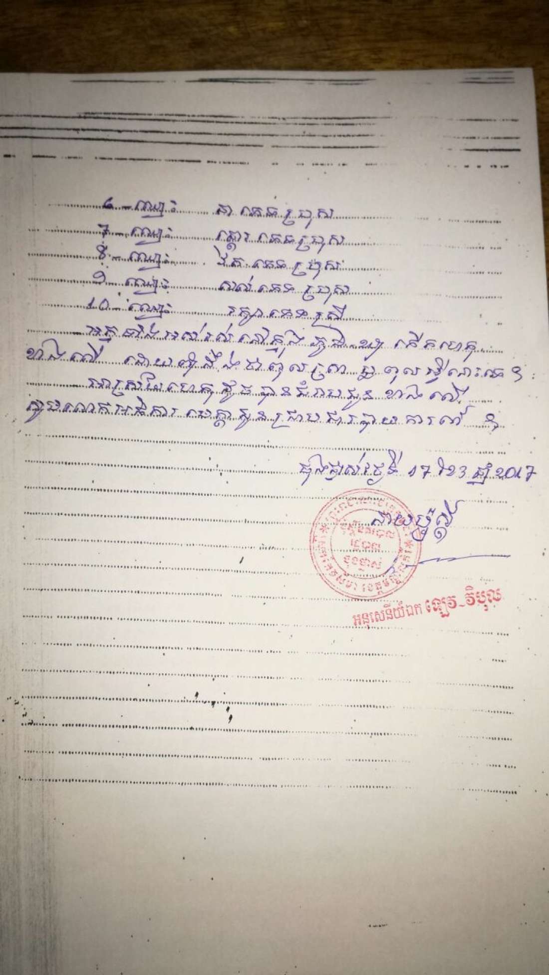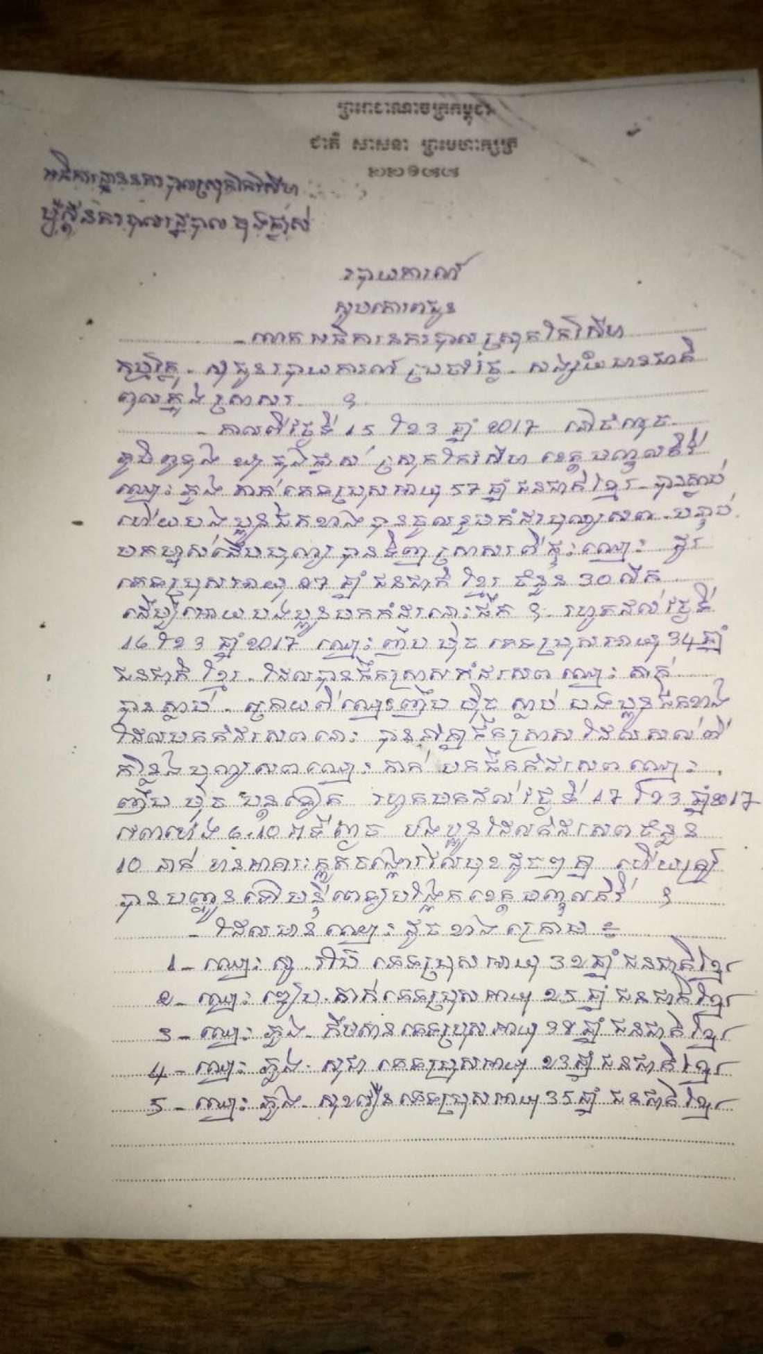 លោកឡេវ វិបុលមេប៉ុស្តិ៍ឃុំចុងផ្លាស់បានបញ្ជាក់ក្នុងរបាយការណ៍ចុះថ្ងៃទី១៧ខែមីនាឆ្នាំ២០១៧ថាជនរងគ្រោះរួមមាន៖ឈ្មោះ គា ភេទប្រុស ឈ្មោះ ឆ្តោ ភេទប្រុស ឈ្មោះសល់ភេទប្រុសឈ្មោះរក្សា ភេទស្រី ឈ្មោះសូ រប៉ែភេទប្រុសអាយុ៣២ឆ្នាំ ឈ្មោះឌៀប តាក់ភេទប្រុសអាយុ២៥ឆ្នាំឈ្មោះ ភួង គឹមសាន ភេទប្រុសអាយុ៣៨ឆ្នាំឈ្មោះភួង សុជា ភេទប្រុសអាយុ២៣ឆ្នាំនិងឈ្មោះភួង សុខវឿនភេទប្រុសអាយុ៣៥ឆ្នាំ។