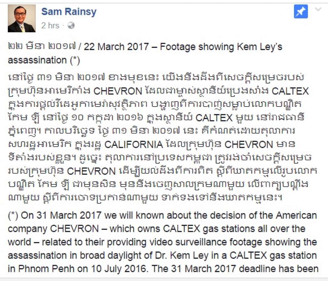 រាជធានីភ្នំពេញ៖ លោកសម រង្ស៊ីអតីតប្រធានគណបក្សសង្រ្គោះជាតិនៅថ្ងៃទី២២ខែមីនាឆ្នាំ២០១៧នេះបានសរសេរលើកបណ្តាញសង្គមហ្វេសប៊ុករបស់លោកថានៅថ្ងៃ ៣១ មិនា ២០១៧ ខាងមុខនេះ យើងនឹងដឹងពីសេចក្តីសម្រេចរបស់ក្រុមហ៊ុនអាមេរិកាំង CHEVRON ដែលជាម្ចាស់ស្ថានីយ៍ប្រេងសាំង CALTEX ក្នុងការផ្តល់វីដេអូកាមេរ៉ាសុវត្ថិភាព បង្ហាញពីការបាញ់សម្លាប់លោកបណ្ឌិត កែម ឡី នៅថ្ងៃ ១០ កក្កដា ២០១៦ ក្នុងស្ថានីយ៍ CALTEX មួយ នៅរាជធានីភ្នំពេញ។