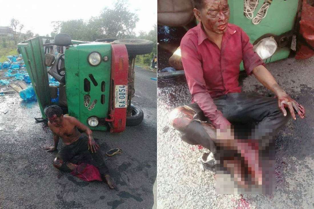 ព្រះវិហារ ៖ បុរស២នាក់ត្រូវរងរបួសធ្ងន់រហូតត្រូវហូរឈាមស្ទើរខ្សោះខ្លួន ក្រោយពួកគេទាំង២ស្រវឹង បើករថយន្តដឹកទឹកសុទ្ធក្នុងល្បេឿនលេឿនមិនប្រយ័ត្នរេចង្កូតជ្រុលក្រឡាប់ ត្រង់ចំណុចផ្លូវកោង ស្ថិតតាមបណ្តោយផ្លូវជាតិលេខ៩ ក្បែរស្ពានតាហូត ស្ថិតនៅភូមិពោរ៍ទាប ឃុំម្លូព្រៃ ស្រុកឆែប ខេត្តព្រះវហារ កាលពីវេលាល្ងាចថ្ងៃទី ២២ ខែមេសា ឆ្នាំ២០១៧ ។