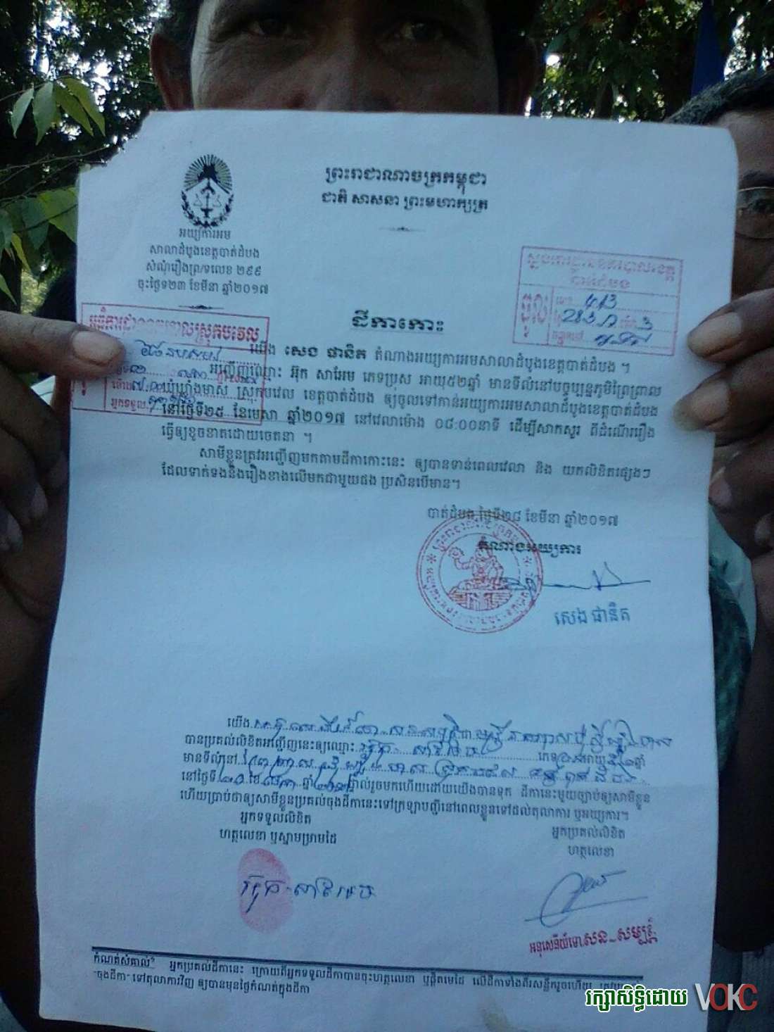 ប្រជាពលរដ្ឋរស់នៅ ភូមិព្រៃព្រាល ឃុំ ឃ្លាំងមាស ស្រុកបវេល ខេត្តបាត់ដំបង ។ បានទទួលនៅភាពអយុត្តិធម៌ពីតុលាការ ដែលបានចេញដីកាកោះហៅ ឈ្មោះ ៥ រូប ប្រុសទាំង៥ ១ អ៊ុក សាអែម អាយុ ៥២ ឆ្នាំ ២ ជា ឆាង អាយុ ៧១ ឆ្នាំ ៣ ង៉ែត ចិន្ថា អាយុ ៣៦ ឆ្នាំ ៤ ក្រិច ផល្លី អាយុ ៤៥ ឆ្នាំ ៥ ឃួន ចាន់រ៉ា : ដីកាកោះ ថ្ងៃទី ២០ ខែមេសា ឆ្នាំ ២០១៧ និងតំណាងអយ្យការ លោក សេង ផានិត អ្នក ប្រគល់លិខិតហត្តលេខា អនុសេនីយទោ សន សម្បត្តិ ។