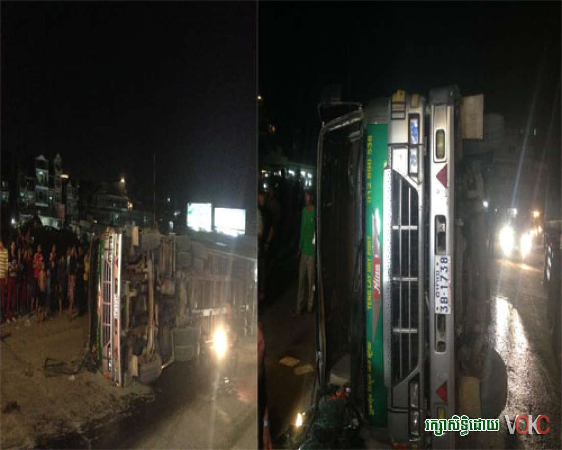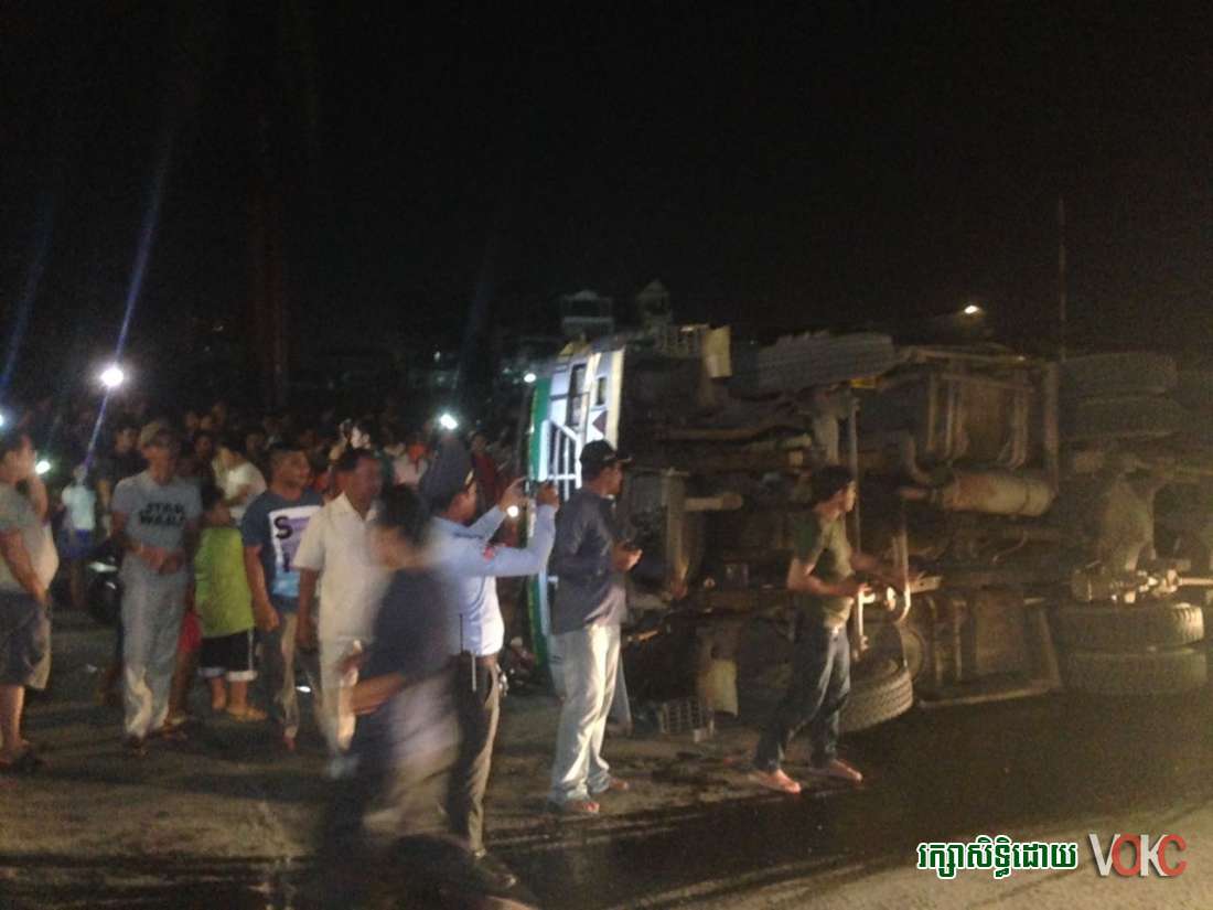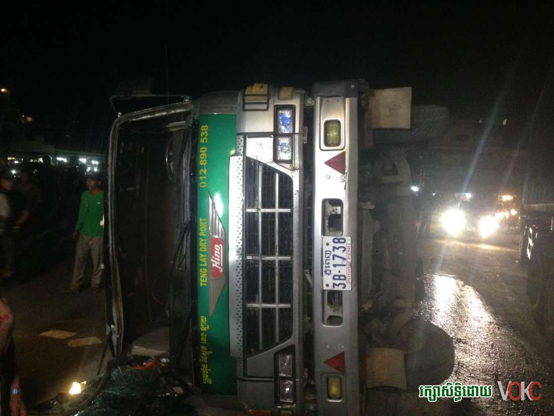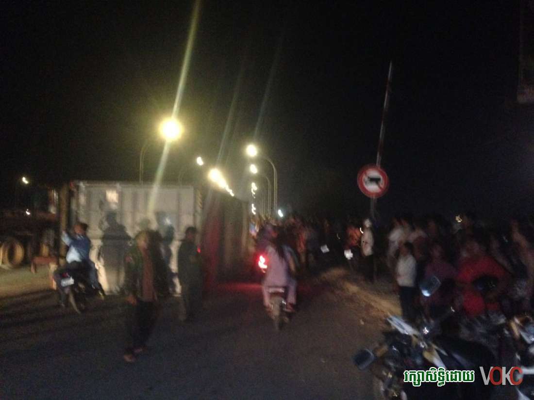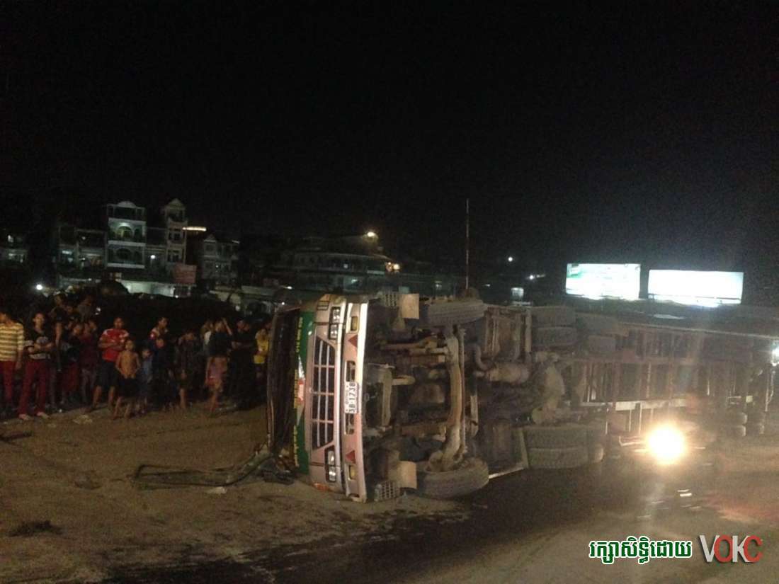 រាជធានីភ្នំពេញ៖ មានគ្រោះថ្នាក់ចរាចរណ៍មួយបានបង្កឲ្យមានការភ្ញាក់ផ្អើលដល់ប្រជាពលរដ្ឋយ៉ាងខ្លាំង ខណះដែលមានរថយន្តកុងតឺន័រមួយគ្រឿងបានបើកបត់លឿនមិនប្រយ័ត្ឋបណ្ដាលឲ្យក្រឡាប់ផ្ងារជើងឡើងលើ កាលពីវេលាម៉ោង៨និង១០នាទីយប់ ថ្ងៃទី២៧ ខែមេសា ឆ្នាំ២០១៧ ស្ថិតនៅចំណុចគល់ស្ពានព្រះមុន្នីវង្សចាស់ នៅក្នុងសង្កាត់ច្បារអំពៅ២ ខណ្ឌច្បារអំពៅ ។