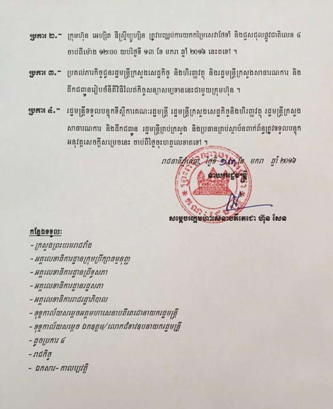 កង្វល់និងការព្រួយបារម្ភរបស់ប្រជាពលរដ្ឋ គឺជាកង្វល់និងការព្រួបារម្ភរបស់ខ្ញុំផ្ទាល់។ ជាពិសេសពលរដ្ឋដែលរស់នៅតាមបណ្តោយផ្លូវជាតិលេខ ៤ និងប្រជាពលរដ្ឋទូទាំងប្រទេសដែលធ្វើដំណើរឆ្លងកាត់ផ្លូវនេះទាំងអស់គឺបានសំណូមពរមករាជរដ្ឋាភិបាល និងខ្ញុំផ្ទាល់អំពីការពិបាកគ្រប់យ៉ាងក្នុងការបង់លុយសម្រាប់ធ្វើដំណើរលើផ្លូវជាតិមួយនេះ។ ខ្ញុំបានស្តាប់ និងបានពិភាក្សាជាមួយរដ្ឋមន្រ្តីក្រសួងហិរញ្ញវត្ថុ រដ្ឋមន្រ្តីក្រសួងសាធារណការនិងដឹកជញ្ជូន ហើយនៅក្នុងថ្ងៃប្រជុំសភាថ្ងៃនេះ ក្នុងនាមខ្ញុំជានាយករដ្ឋមន្រ្តី គឺបានសម្រេចបញ្ឈប់មិនអោយយកលុយទាំងស្រុងពីអ្នកធ្វើដំណើរចាប់ពី ម៉ោង១២ យប់ ថ្ងៃទី១៣ មករា ២០១៦នេះតទៅ។