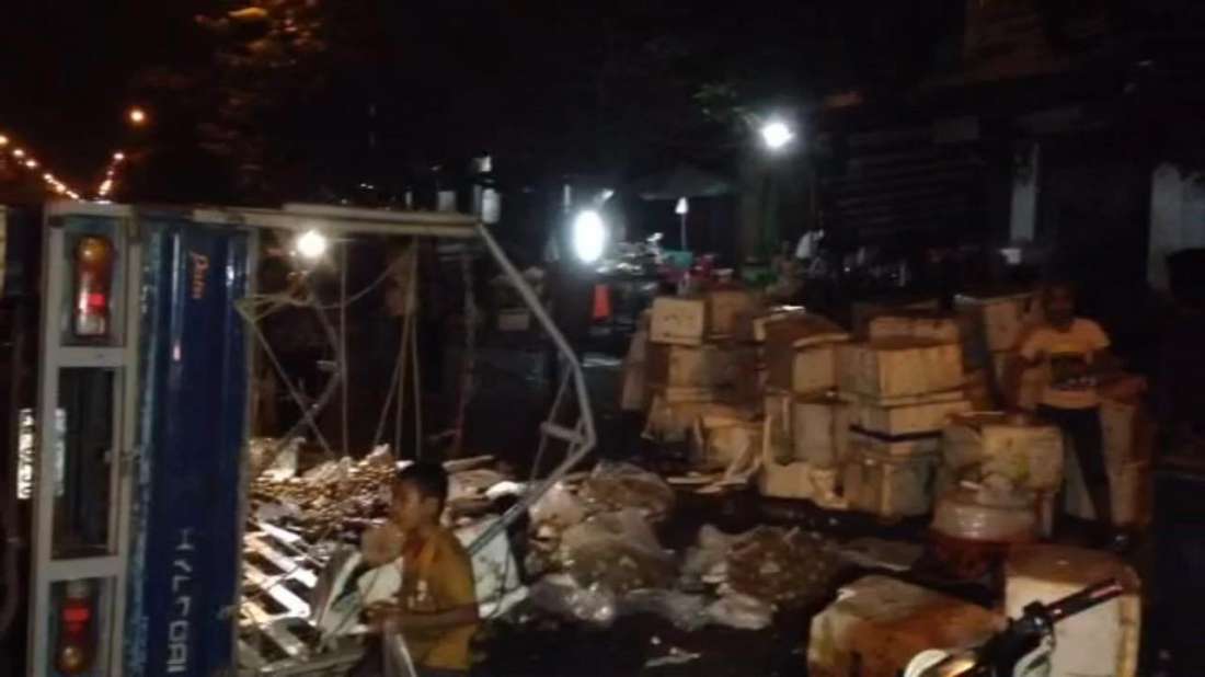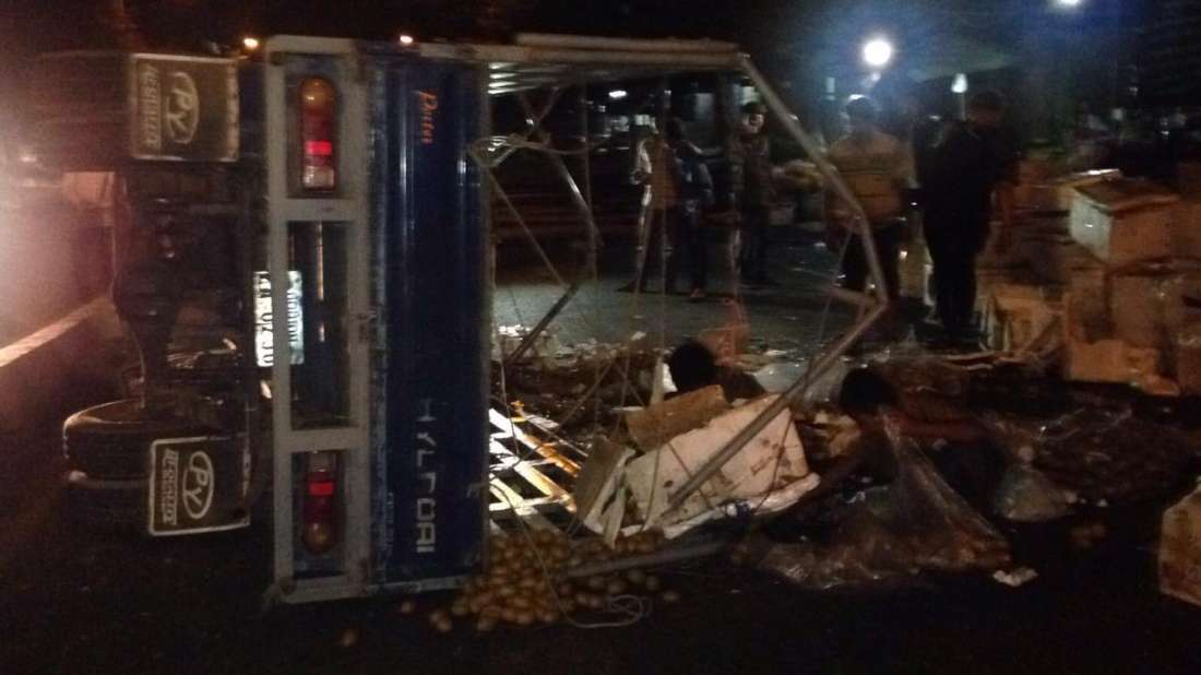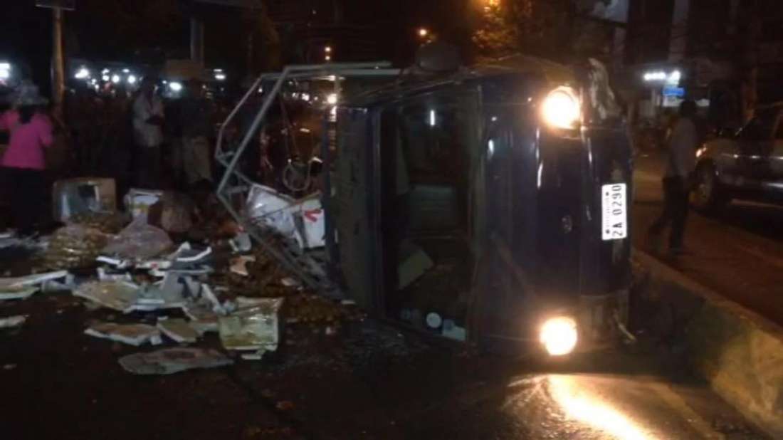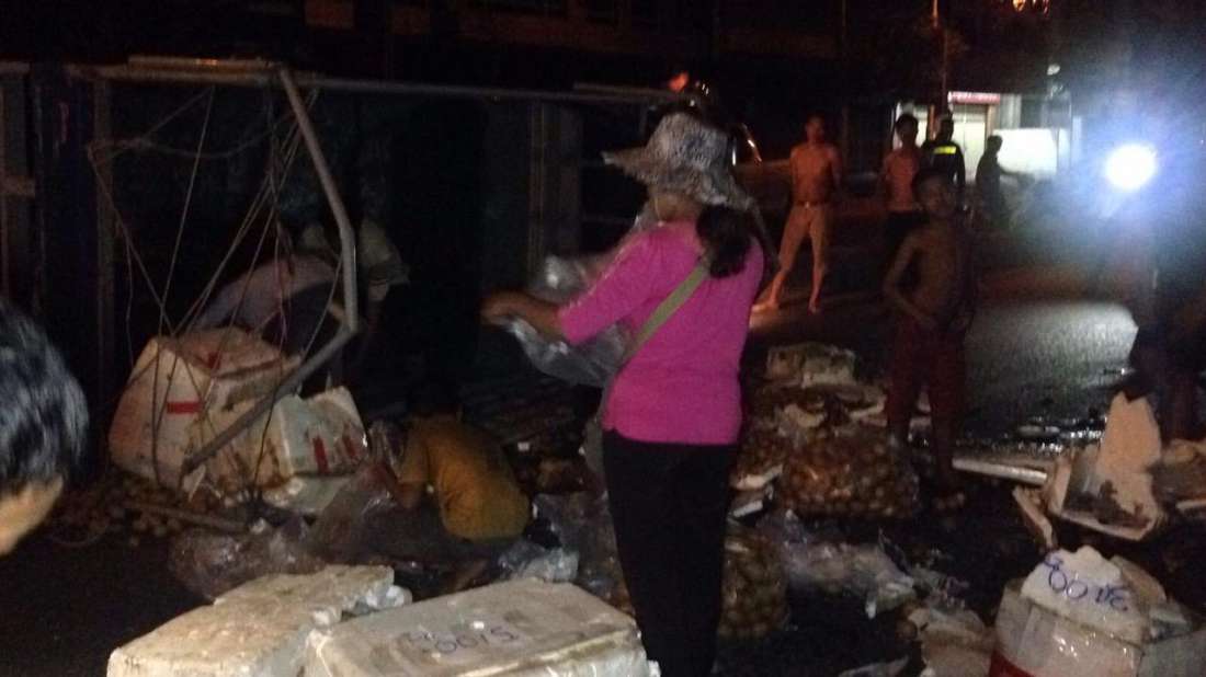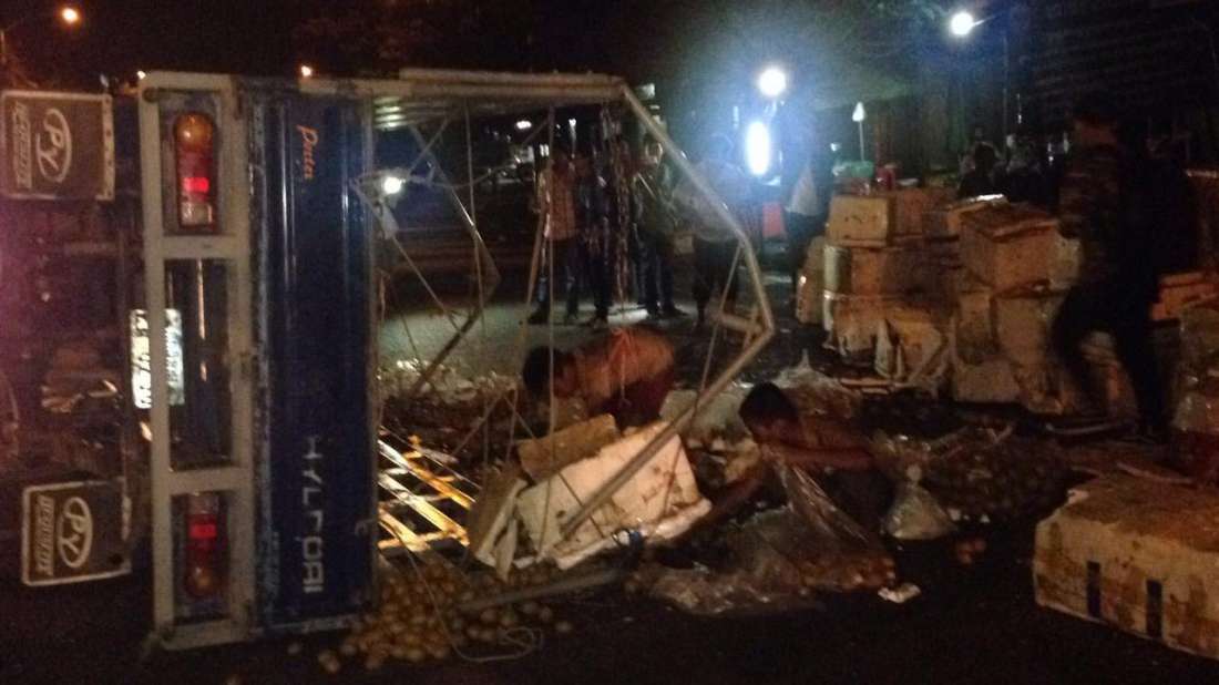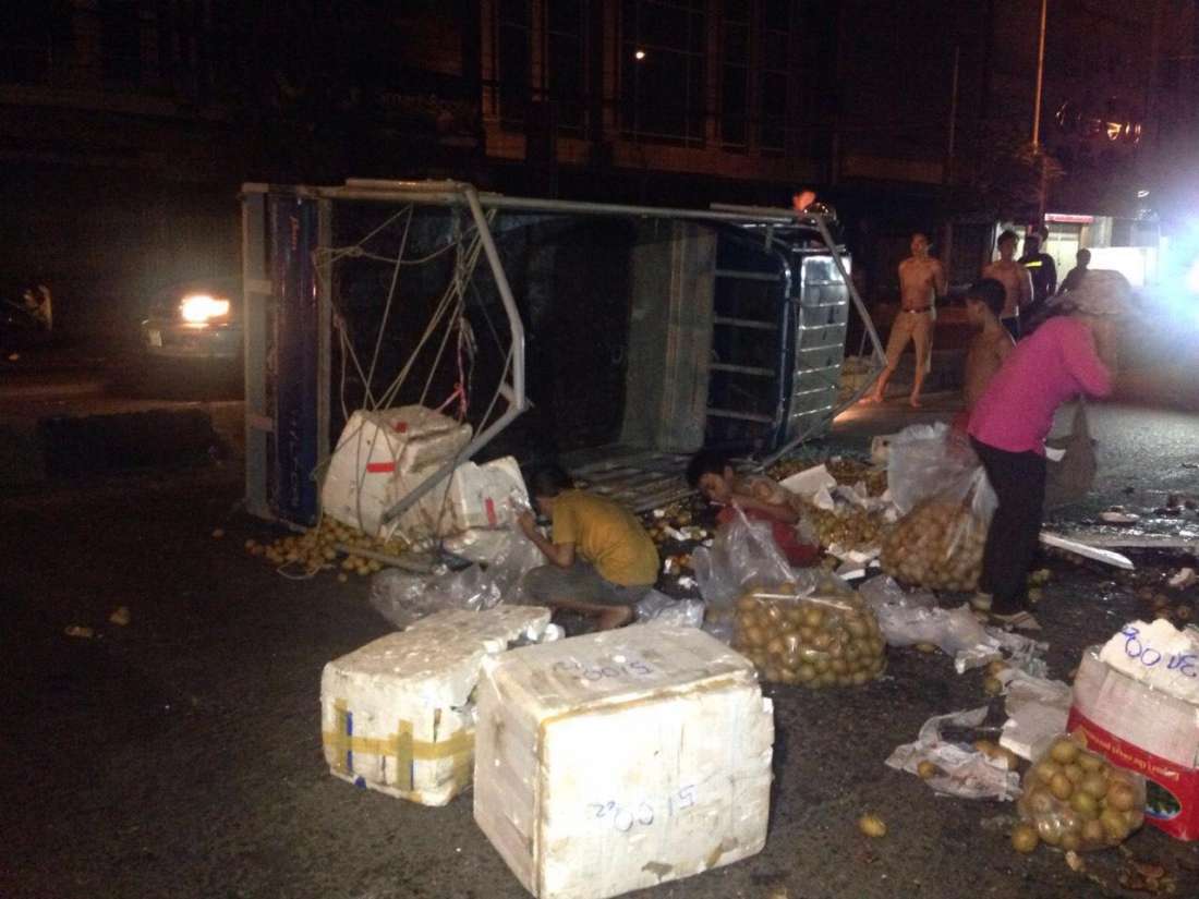 ភ្នំពេញ៖ បុរសម្នាក់ទំនងជាងងុយដេកបានបើករថយន្តកូរ៉េដឹកផ្លែឈើពេញព្រៀប ទៅបុកនឹងរបាំងថ្មពុះចែកទ្រូងផ្លូវខូចខាតចំនួន២កង់ ហើយរថយន្តបានក្រឡាប់ចាក់ផ្លែឈើពាសពេញផ្លូវ សំណាងល្អមិនអ្នករងរបួស ។ ហេតុការណ៍នេះបានកើតឡើងកាលពីវេលាម៉ោង១នឹង១០នាទីរំលងអាធ្រាតឈានចូលថ្ងៃទី២១ ខែមករា ឆ្នាំ២០១៦ ខាងលិចផ្សារដើមគ តាមបណ្តោយផ្លូវម៉ៅសេទុង ស្ថិតក្នុងសង្កាត់ផ្សារដើមគ ខណ្ឌទួលគោក ។